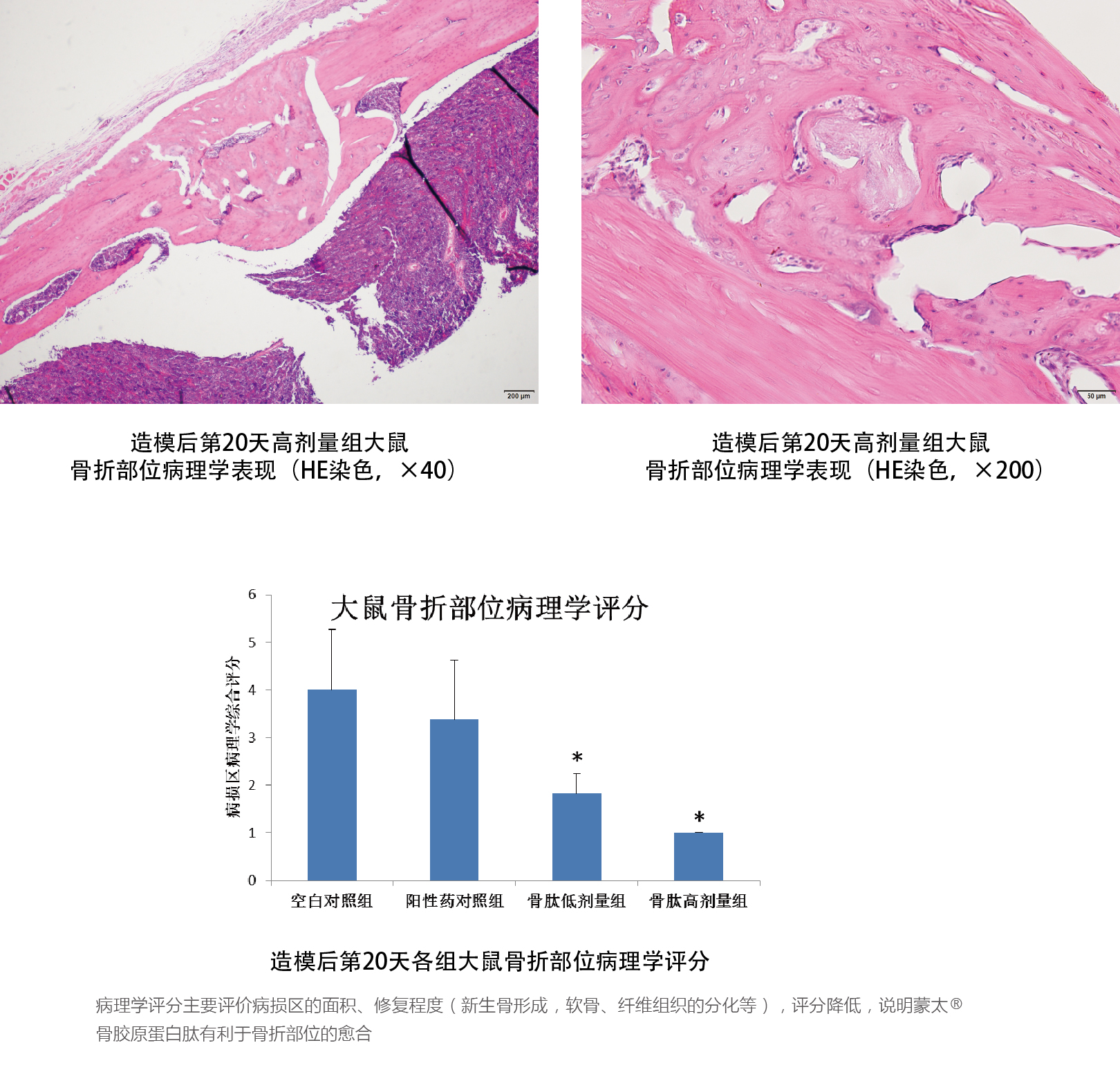北京理工大學研究報告顯示:蒙太®骨膠原蛋白肽對于大鼠脛骨骨折的愈合具有促進作用。在骨折愈合速度上,與陽性藥物對照藥品(愈傷靈)無明顯差異;在骨折部位病理組織學分析中,蒙太®骨膠原蛋白肽低劑量組和高劑量組在修復愈合、縮小病損面積、促進新生骨的形成方面表現(xiàn)出較為明顯的促進作用,優(yōu)于陽性藥物對照藥品(愈傷靈)。